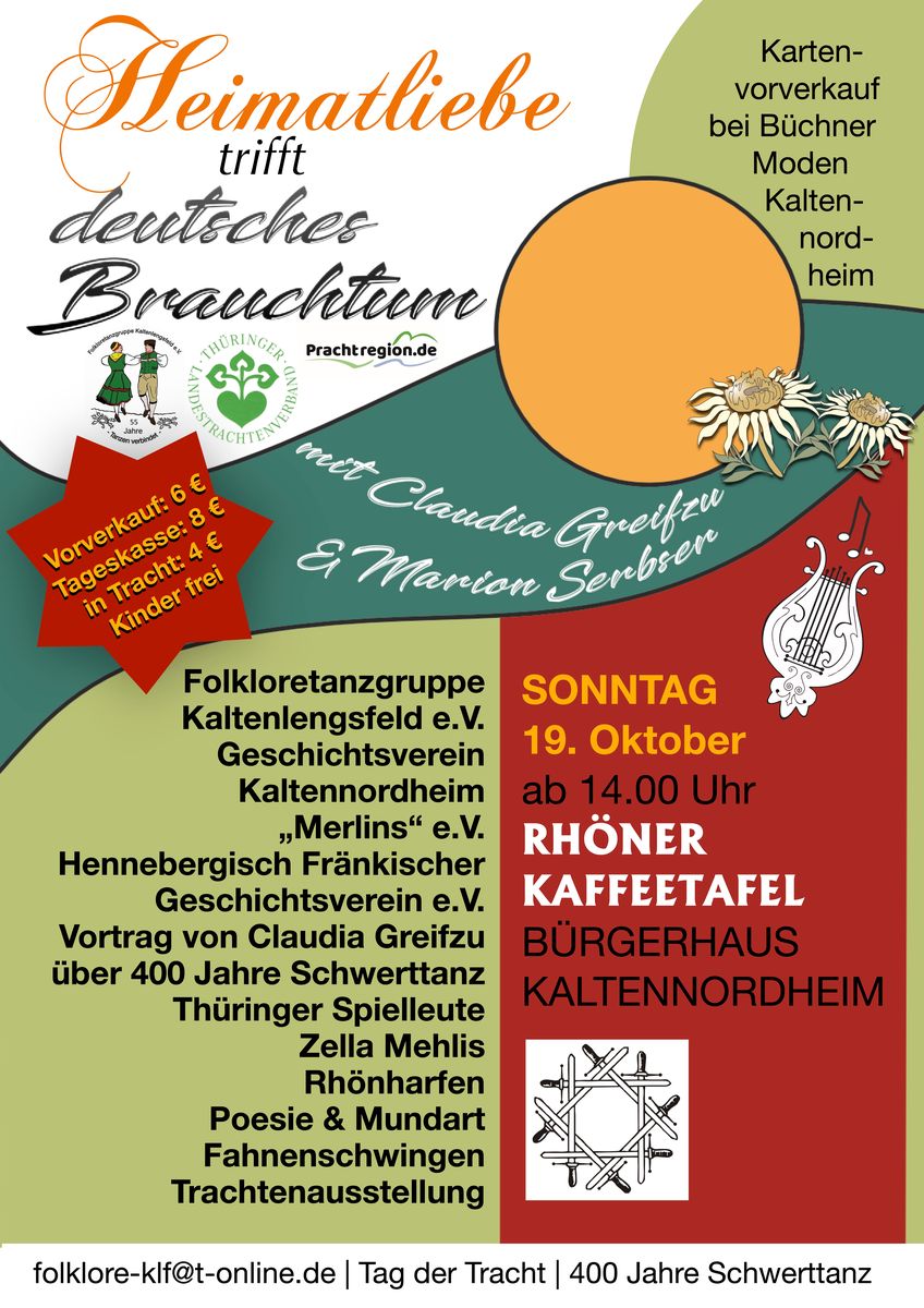 Zum „Tag der Tracht“ am Sonntag, 19.10.2025 möchten wir Sie wieder recht herzlich einladen und gerne an alte aber wertvolle Traditionen zu erinnern. Das Bürgerhaus in Kaltennordheim ist dazu eine gemütliche Räumlichkeit zum Genießen, Erfahren und Bestaunen eines gemeinsamen Heimatnachmittages. Die Förderung des regionalen Brauchtums und der traditionellen Musik soll hierbei guten Anklang finden und zum weiteren Erhalt anregen. Zu erfahren sind Zunftbrauchtum, dazu ein interessanter Vortrag von Claudia Greifzu zum 400 jährigen Schwerttanz in der Region, lebensfrohe Tänze in Tracht ,Fahnenschwingen sowie die Thüringer Spielleute aus Zella Mehlis mit schönen Volksweisen.